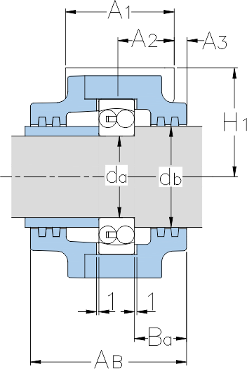 | Housing Designation | Shaft Diameter (da) (mm) | Foot Width (A1) (mm) | A2 (mm) | A3 (mm) | AA (mm) | Centre Height (H1) (mm) | AB (mm) | Foot Height (H2) (mm) | Bolt Size (G) (mm) | Bolt to Bolt Distance (J) (mm) | Lock nut (mm) | ba (mm) | Overall Length (L) (mm) | db (mm) | Felt Strip1) (mm) | Appropriate Bearing | bb (mm) | Locking washer (mm) |